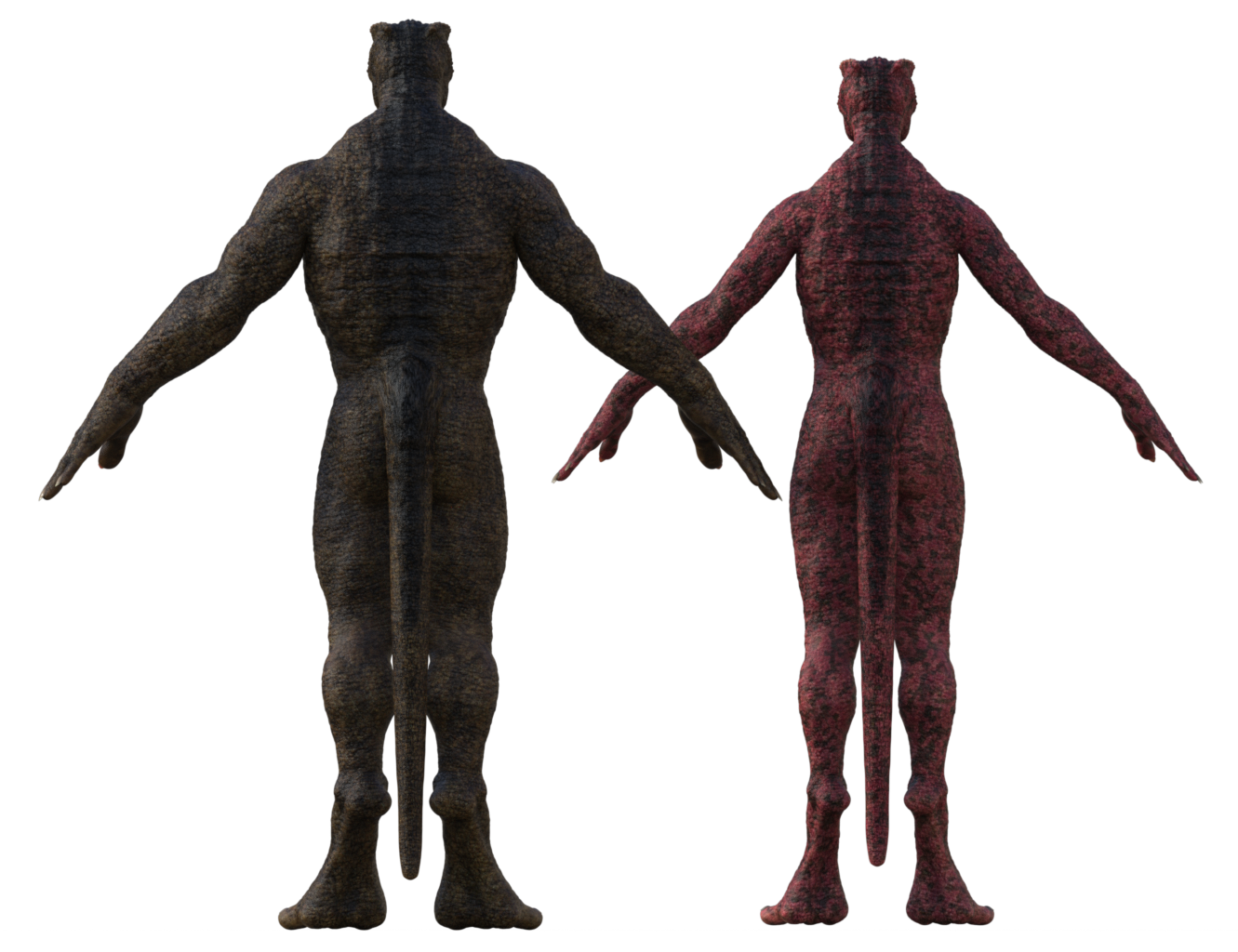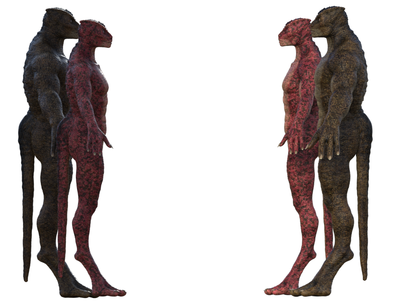 Their thick, prehensile tails act as both counterweights and weapons—used for balance when running and as powerful sweeping strikes in battle. Hands and feet end in keratinized claws capable of fine manipulation or devastating slashes. Their scales are micro-segmented for flexibility, forming natural armor that thickens along the spine and tail.