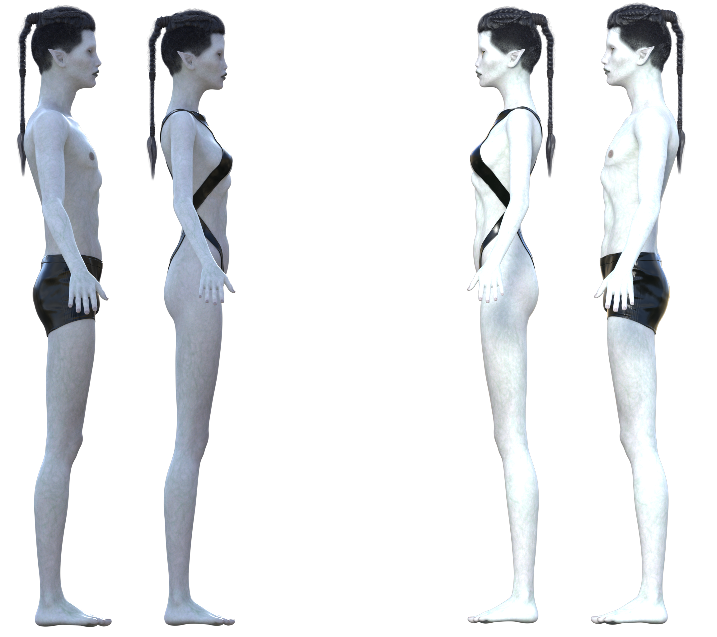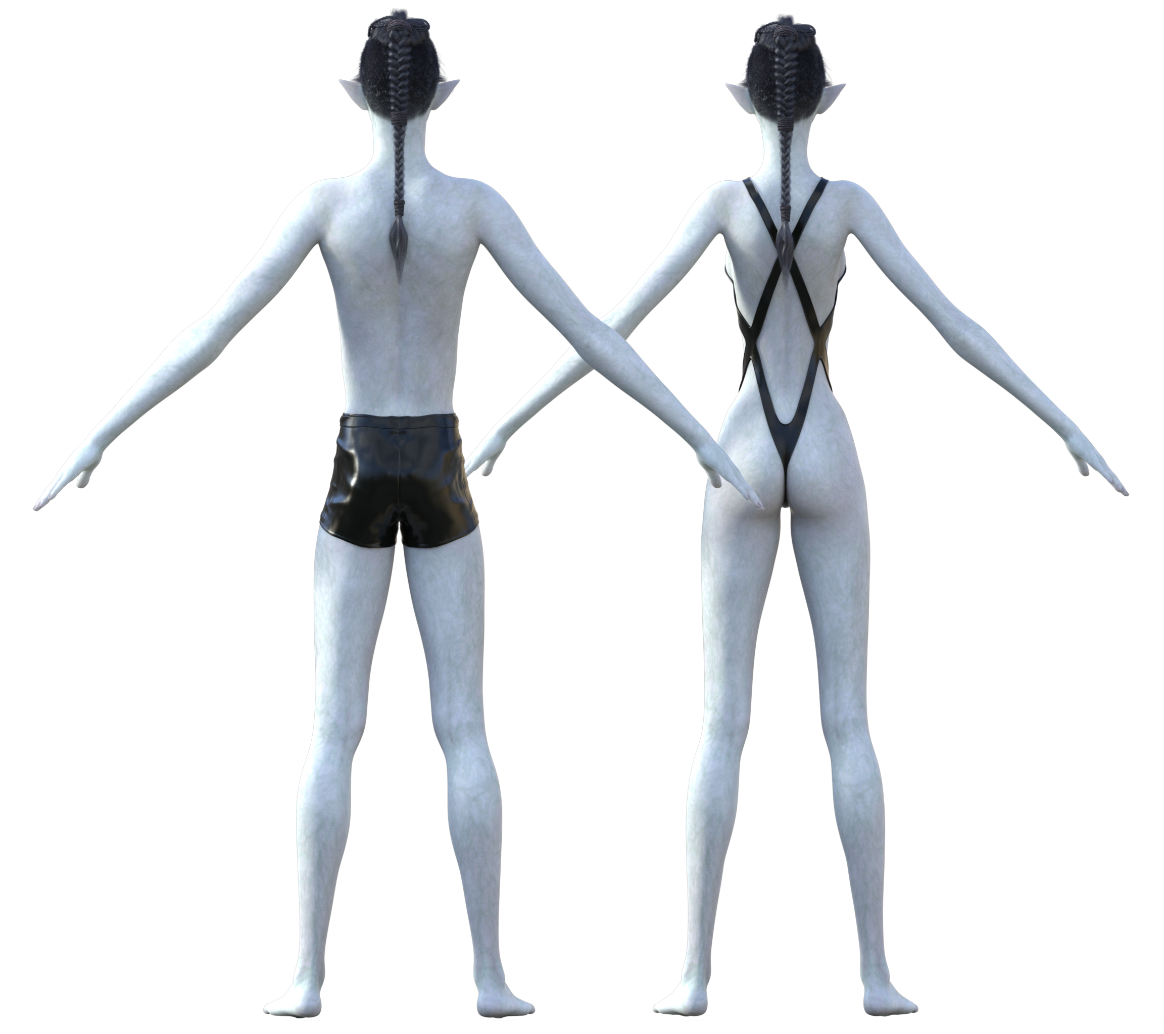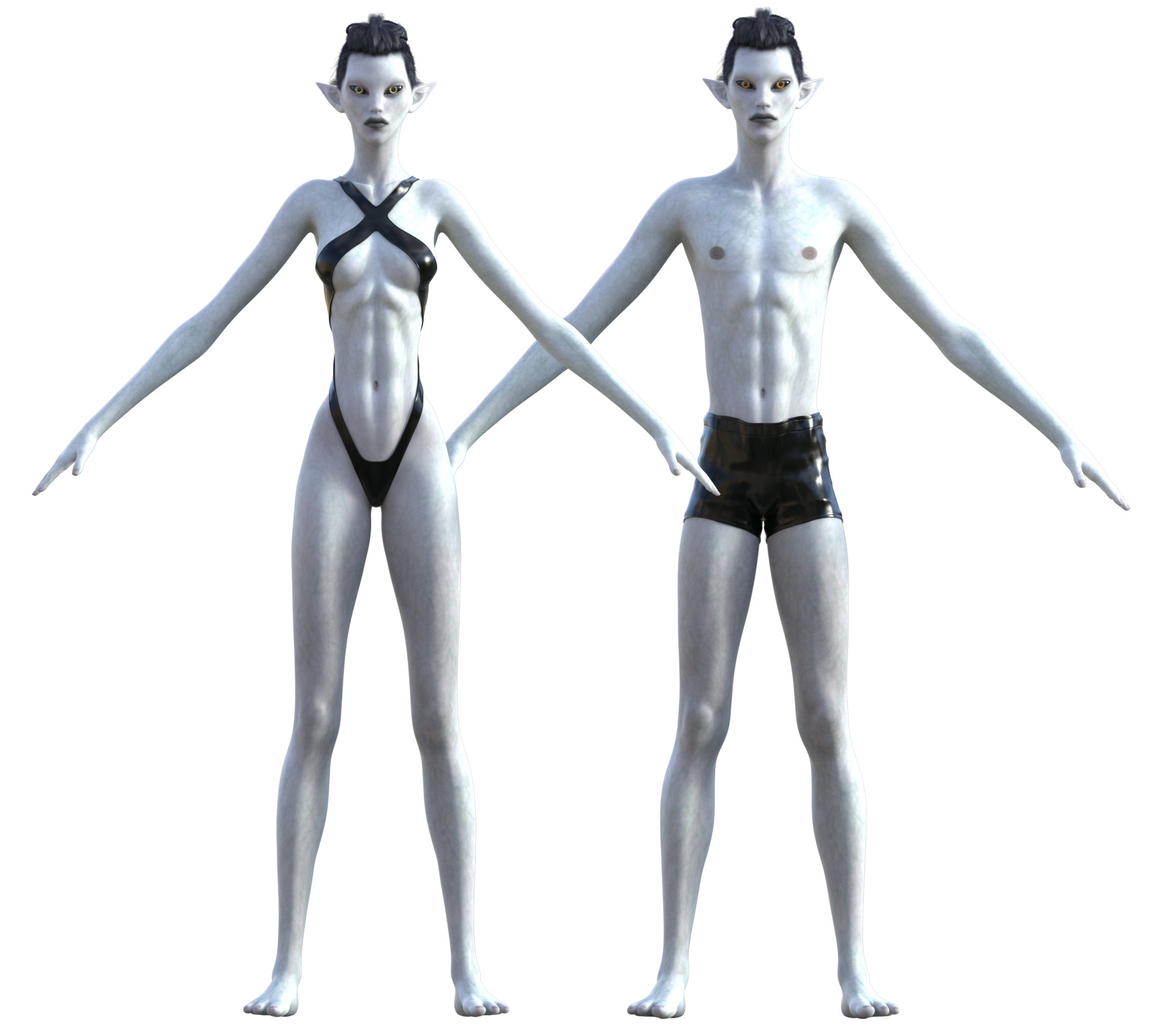 Elvari are entirely hairless. Their eye colors include Amber, Gold, and the rare noble Red (often with a Dark Gray or Black sclera). Skin tones vary from Lavendar, to Dark Violet. Elvari were pioneers in artificial womb technology.