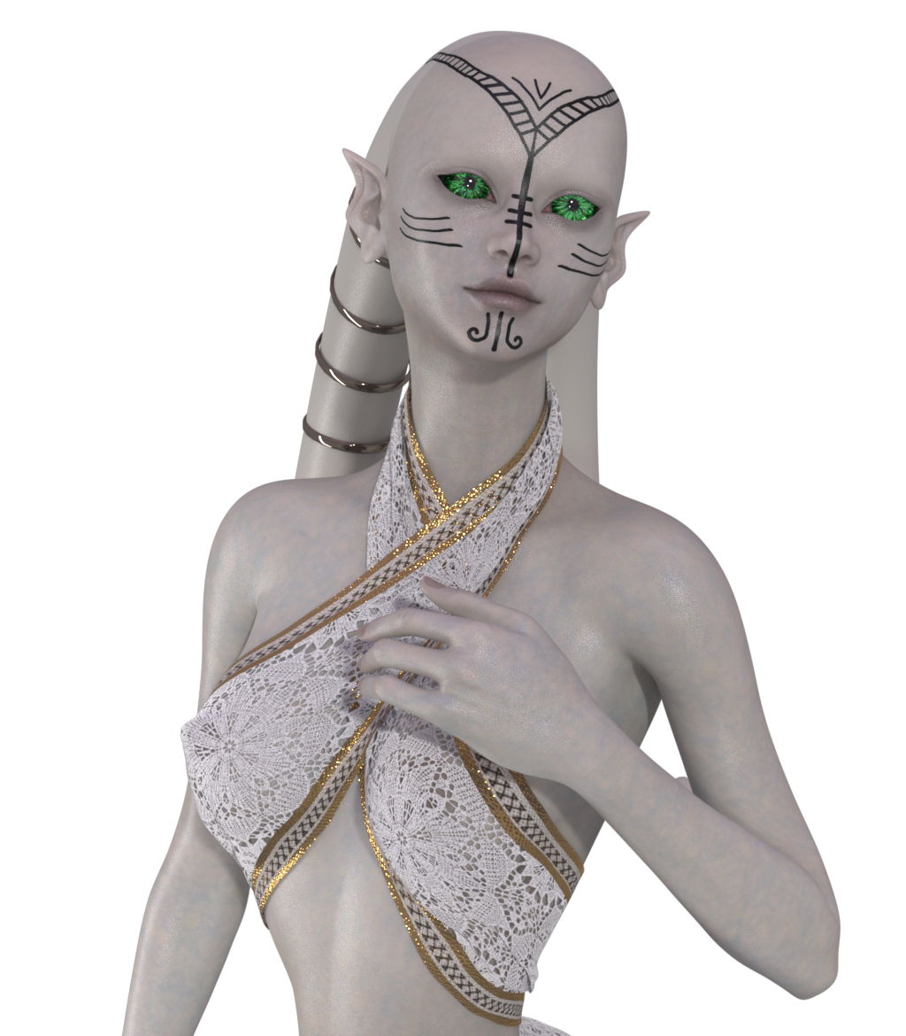 • Skin: Fair and subtly shimmering, enhanced by intricate facial tattoos representing harmony.